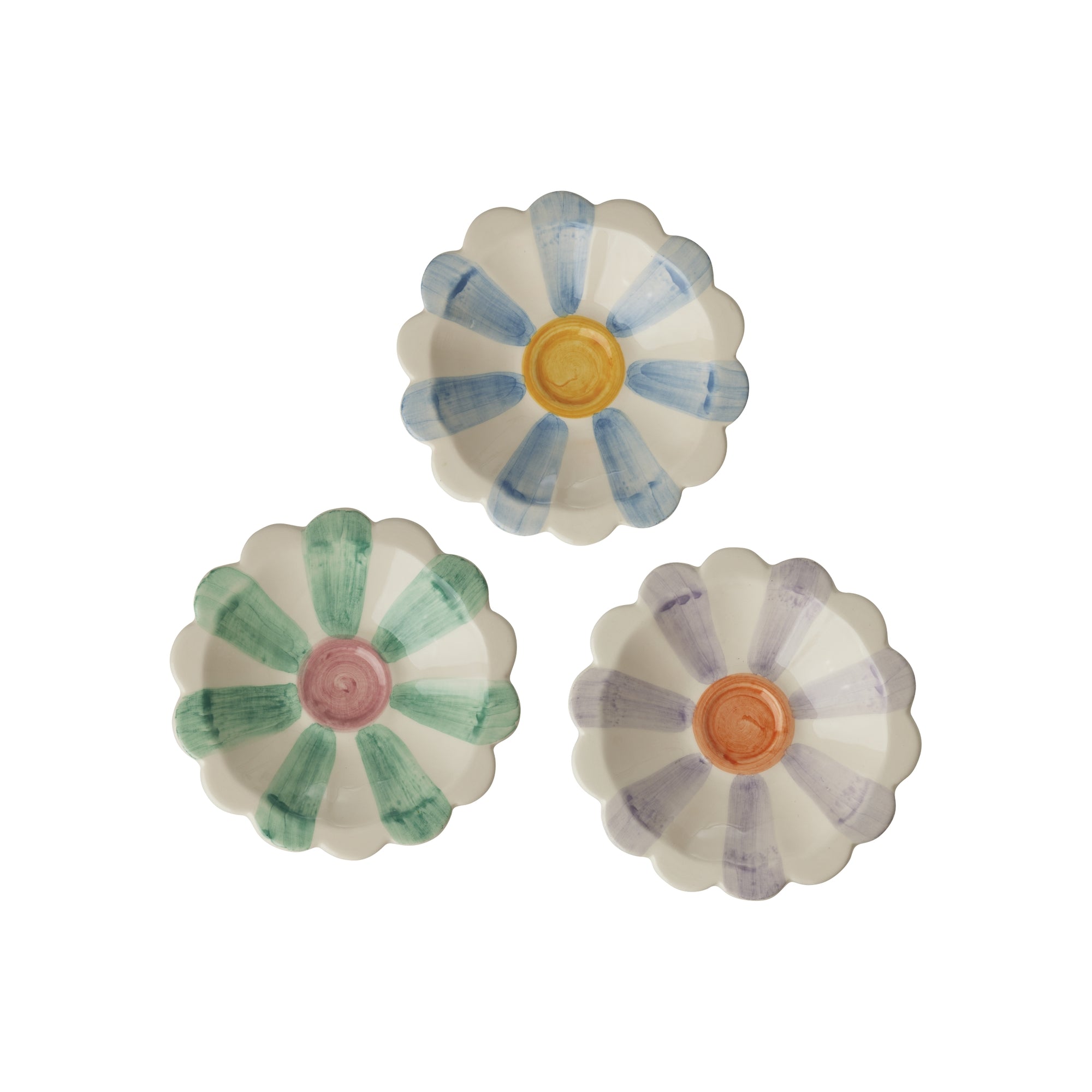 Set of 3 Ceramic Flower Dipping Bowls with Hand-painted Stripes in 3 Asst. Colours - Blue, Green and Lavender