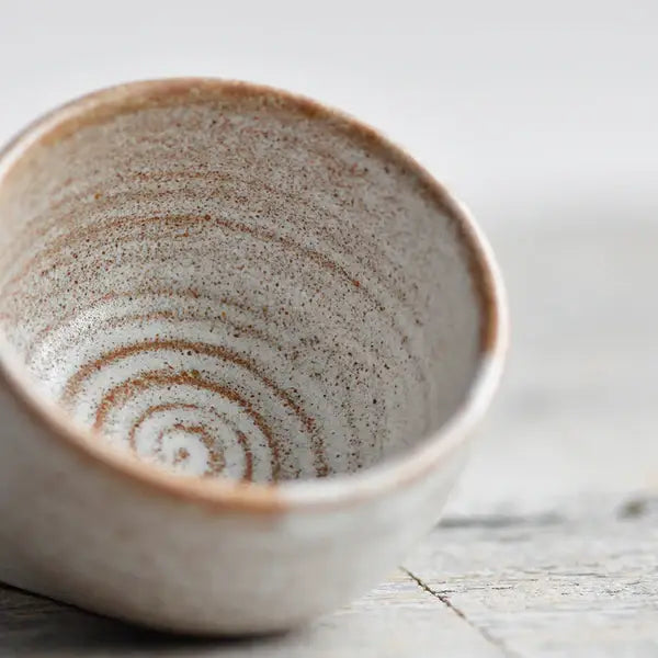 Crafted by hand, this ceramic condiment bowl is a perfect example of artisanal craftsmanship. The wheel-thrown design features clean, straight edges and a smooth rounded base, with a subtle ringed texture that adds character.