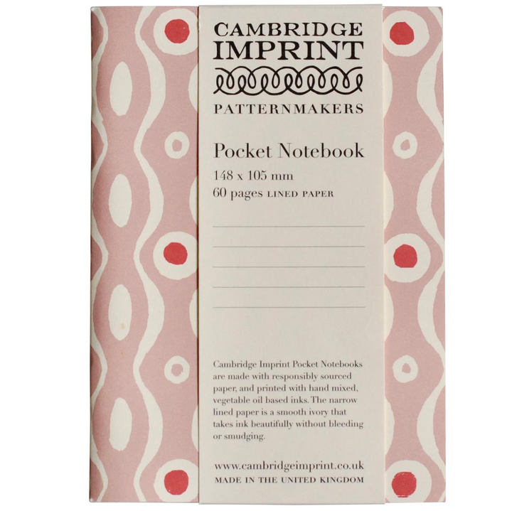 Our simple Pocket Notebooks are A6, a handy size for slipping into your bag, for keeping notes or making lists. They have 60 pages of good quality ivory paper with an elegant narrow line. The covers of smooth cream card are litho-printed with beautiful colours hand-mixed to our specifications. The design runs over the front and back cover without any branding or fussy labelling. There is a simple Cambridge Imprint stamp on the inside back cover.