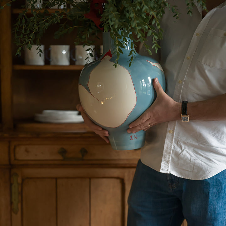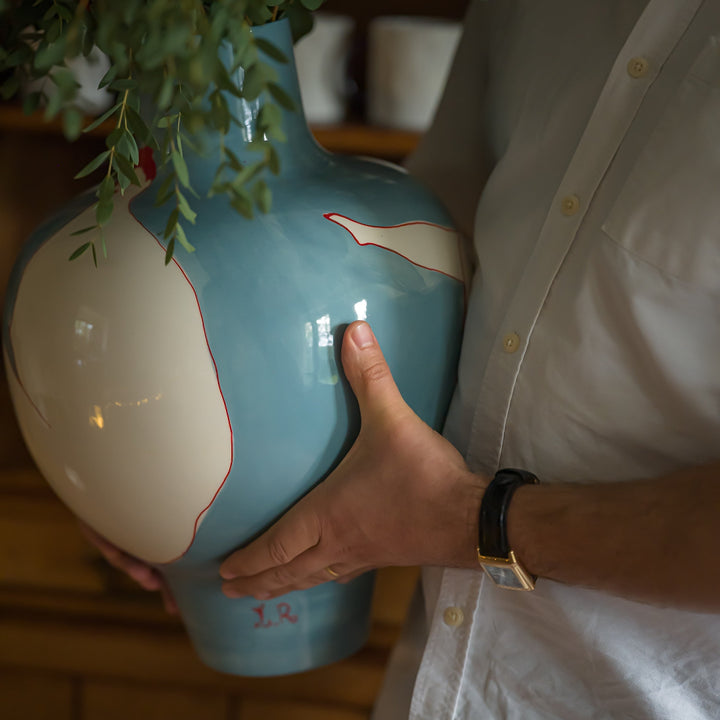 This large vase is hand-painted in Portugal by skilled artisans, imbued with a touch of love and playfulness. Each vase is crafted with precision and care, showcasing the talent and skill of Portuguese artisans. Every piece is uniquely designed with an unmistakable air of charm and whimsy.