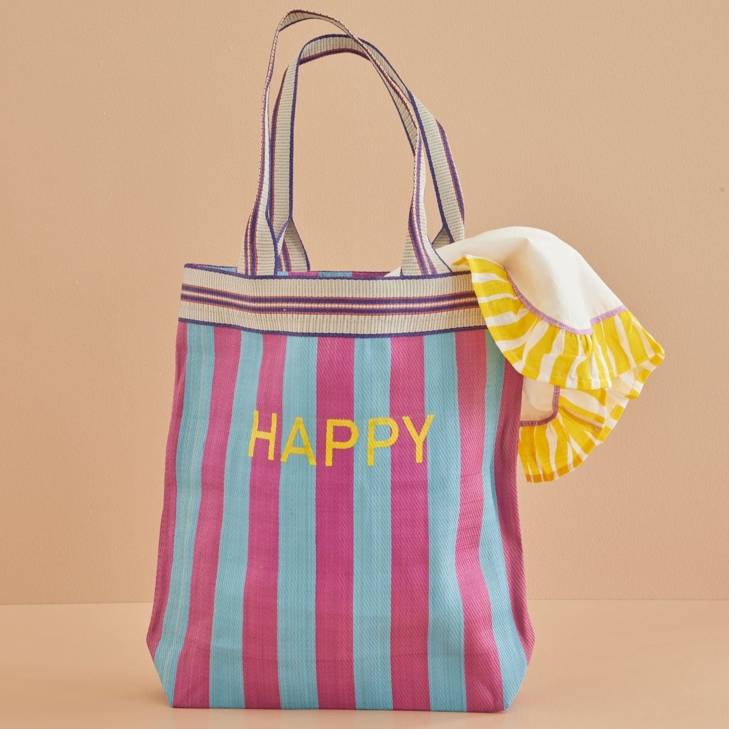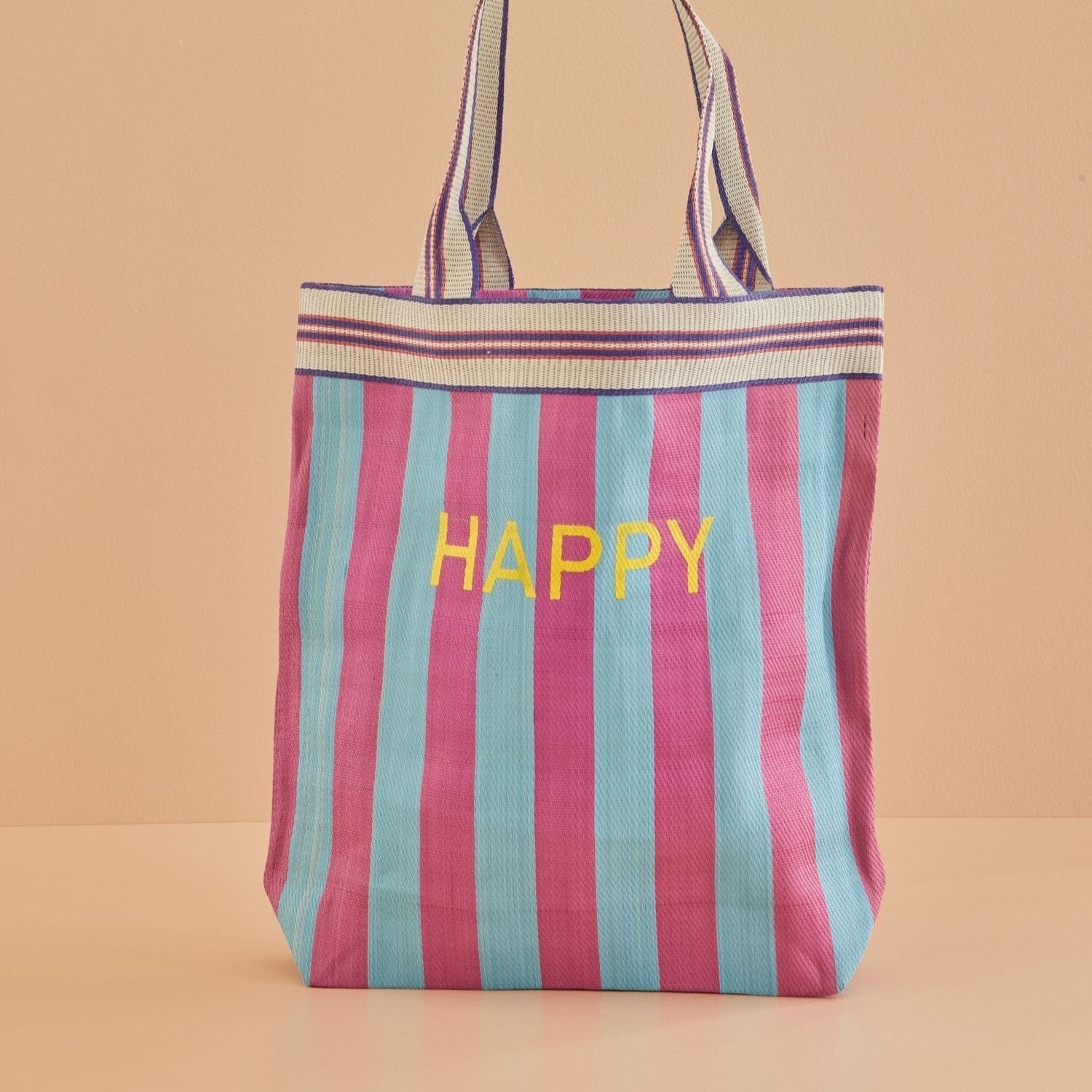 Shopping bag with blue and purple stripes and “HAPPY” written in the middle - made of recycled plastic. The shopping bag is perfect for small errands and grocery shopping… fold it up and place it in your purse or hang it over your shoulder and bring it wherever you need it!