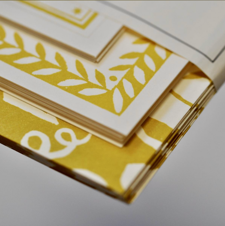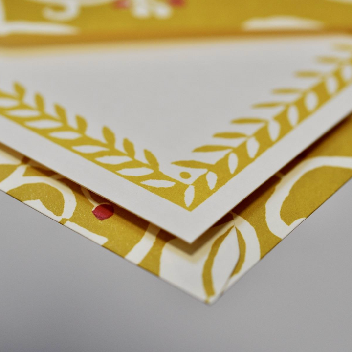 A set of ten Notecards with a patterned border, with matching patterned envelopes and address labels. The Patterned Envelopes are traditional diamond flap envelopes with a water-soluble gummed strip to seal. The Address Labels are self-adhesive. All elements are printed on paper sourced from responsibly managed forests with chain-of-custody certification, and printed in the UK using hand-mixed inks.