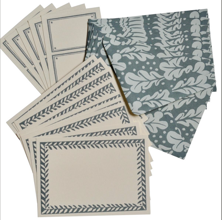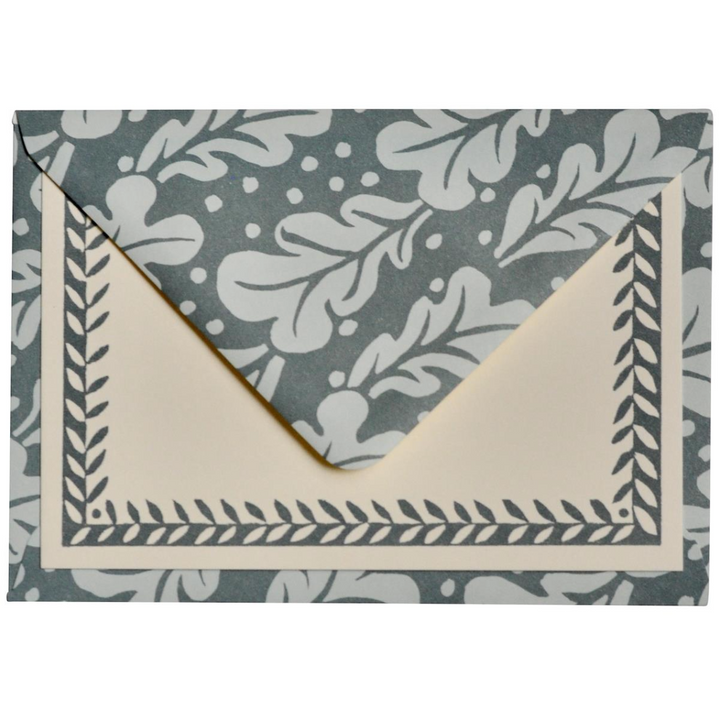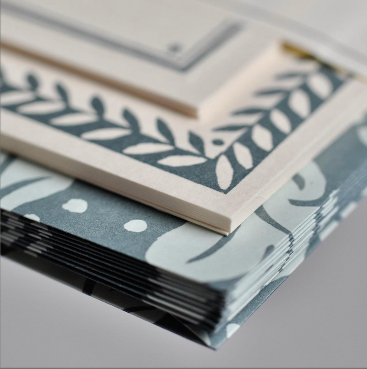 A set of ten Notecards with a patterned border, with matching patterned envelopes and address labels. The Patterned Envelopes are traditional diamond flap envelopes with a water-soluble gummed strip to seal. The Address Labels are self-adhesive. All elements are printed on paper sourced from responsibly managed forests with chain-of-custody certification, and printed in the UK using hand-mixed inks.