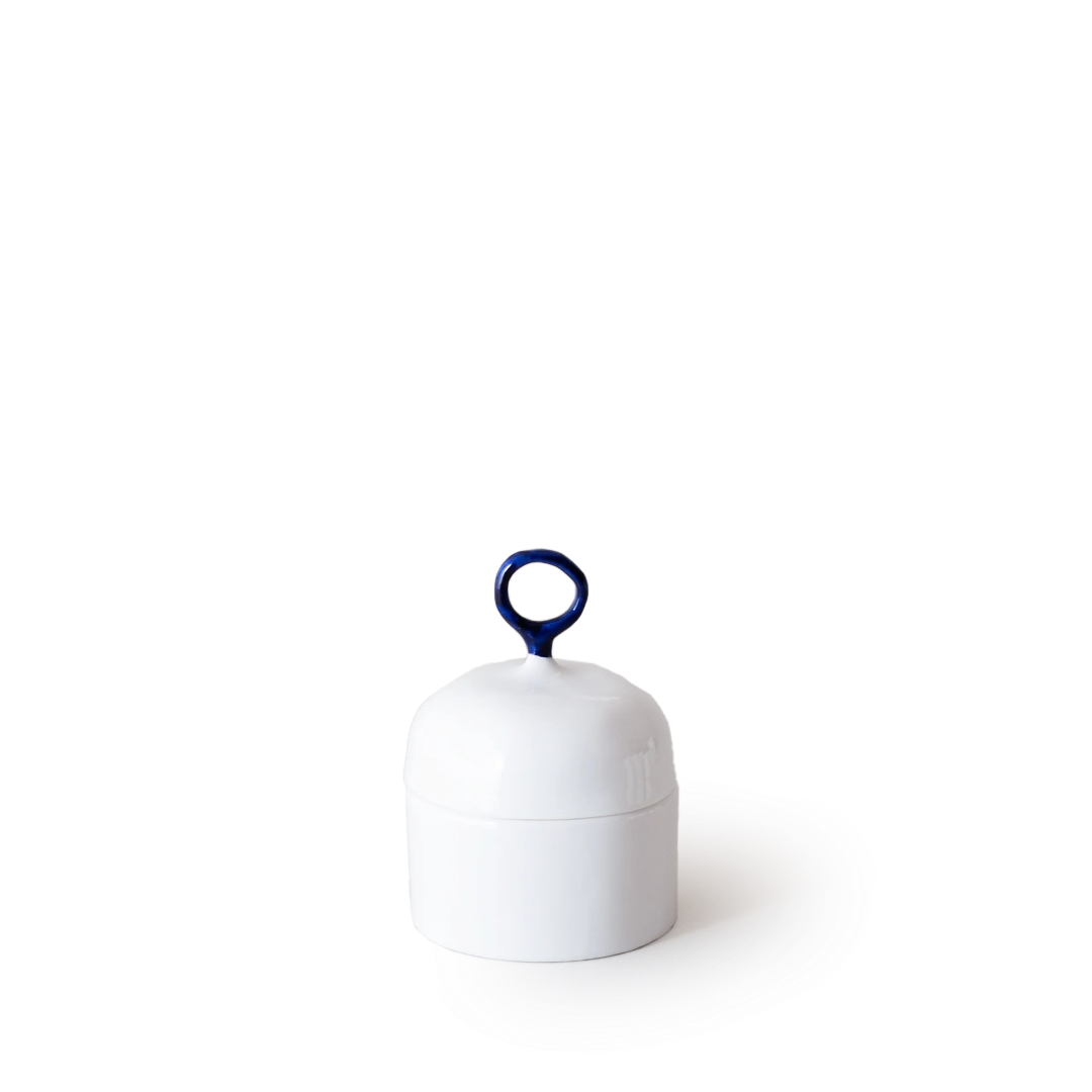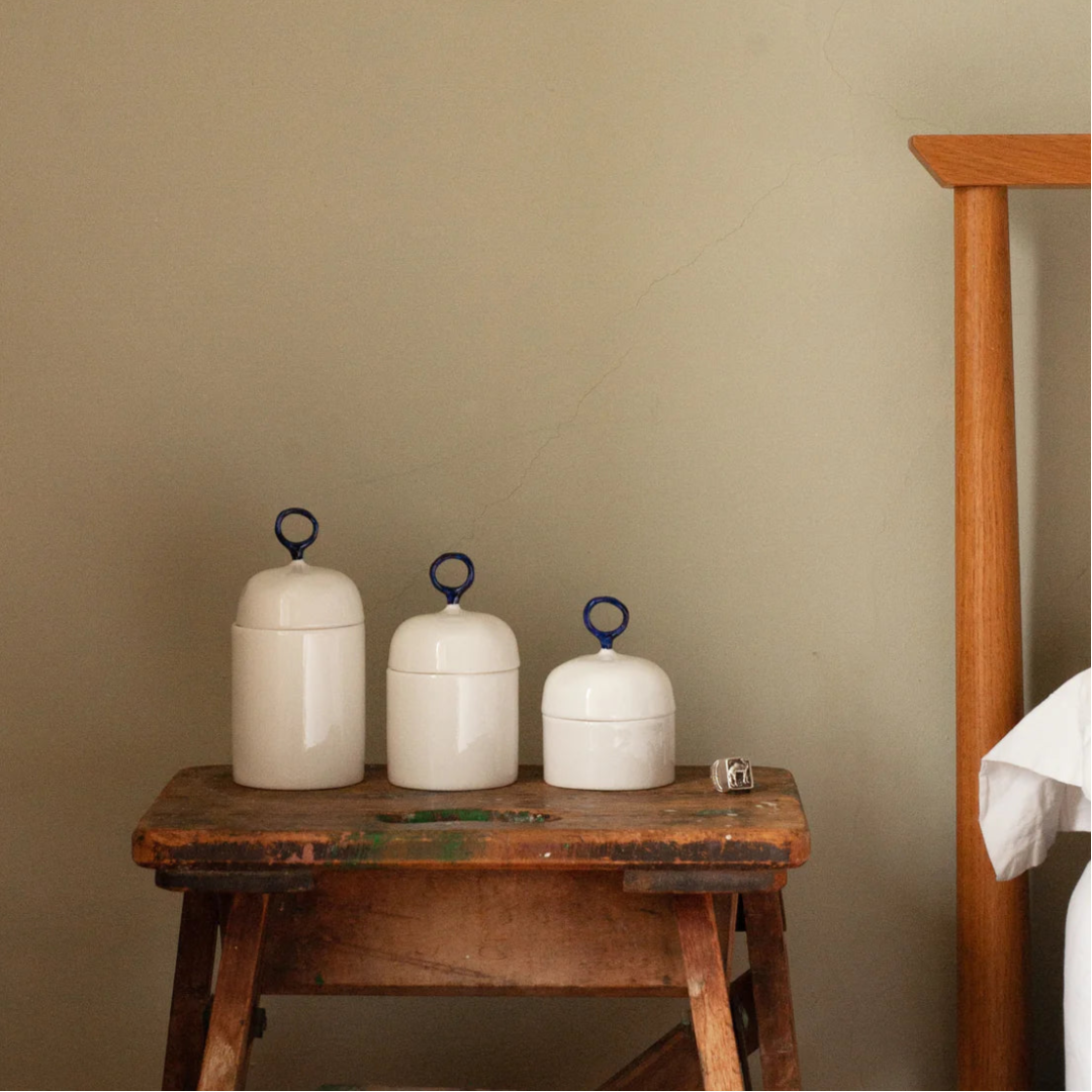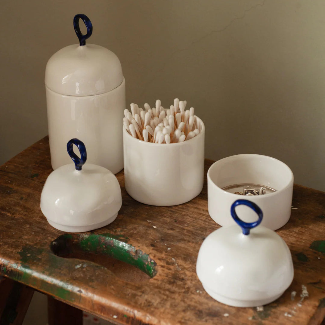 Feldspar trinket pots have lids – ideal for not only hiding away bits and bobs but also for keeping their contents dust-free, with little looped fine bone china handles that are hand-painted in their classic Cobalt. They come in three sizes – small, medium and large. To give an idea of scale, the small are perfect for jewellery, the medium for ear buds and keys and the large for cotton pads or pencils.