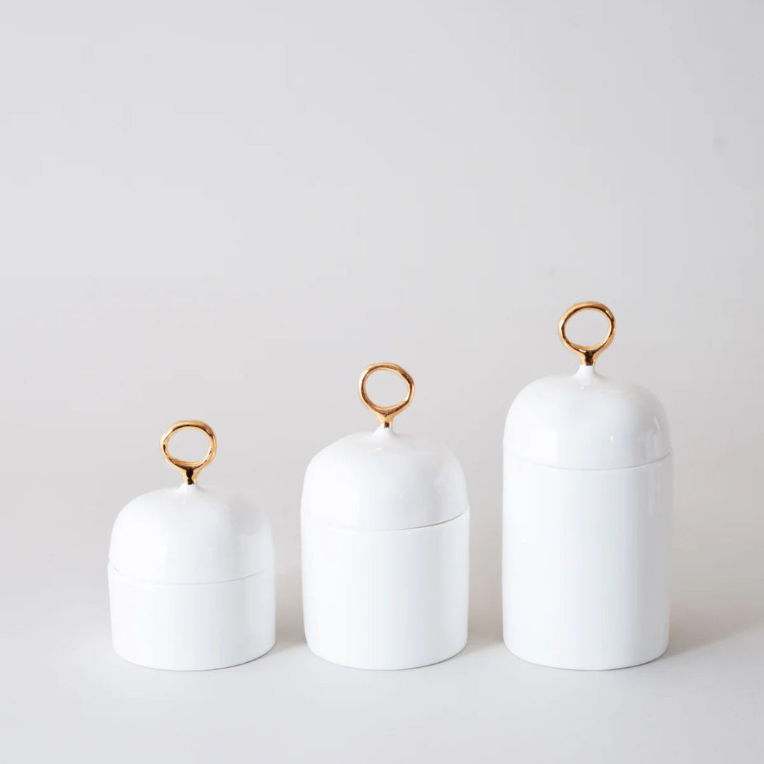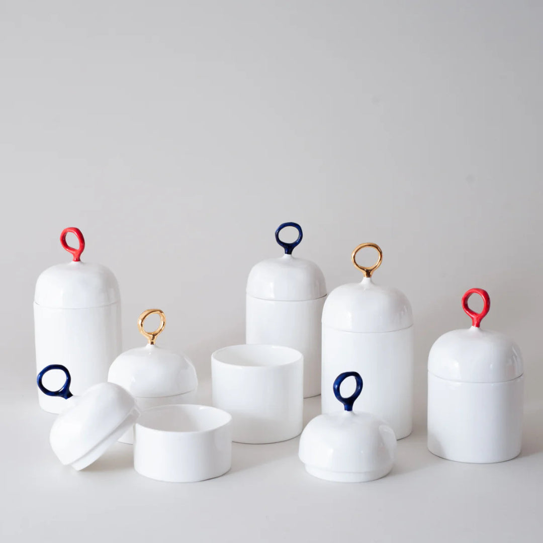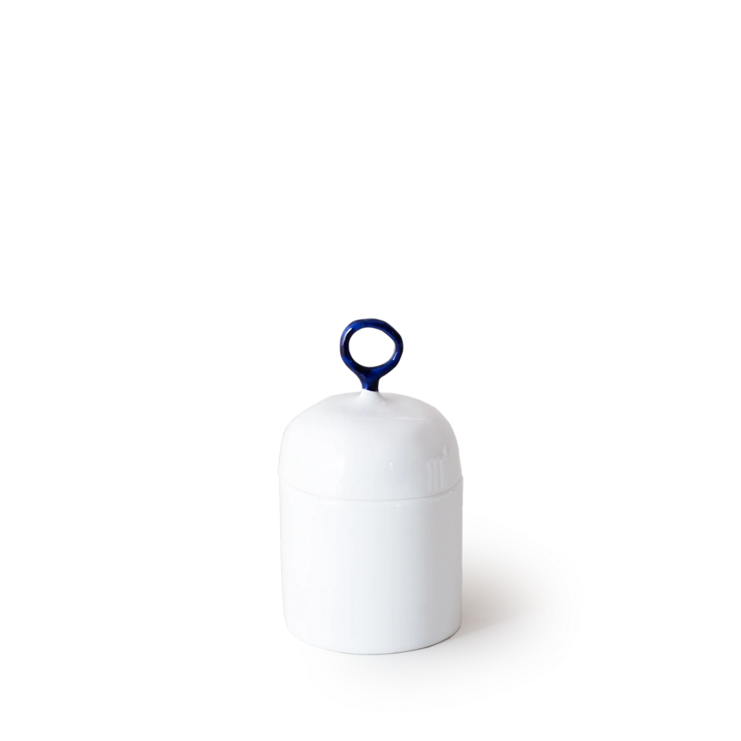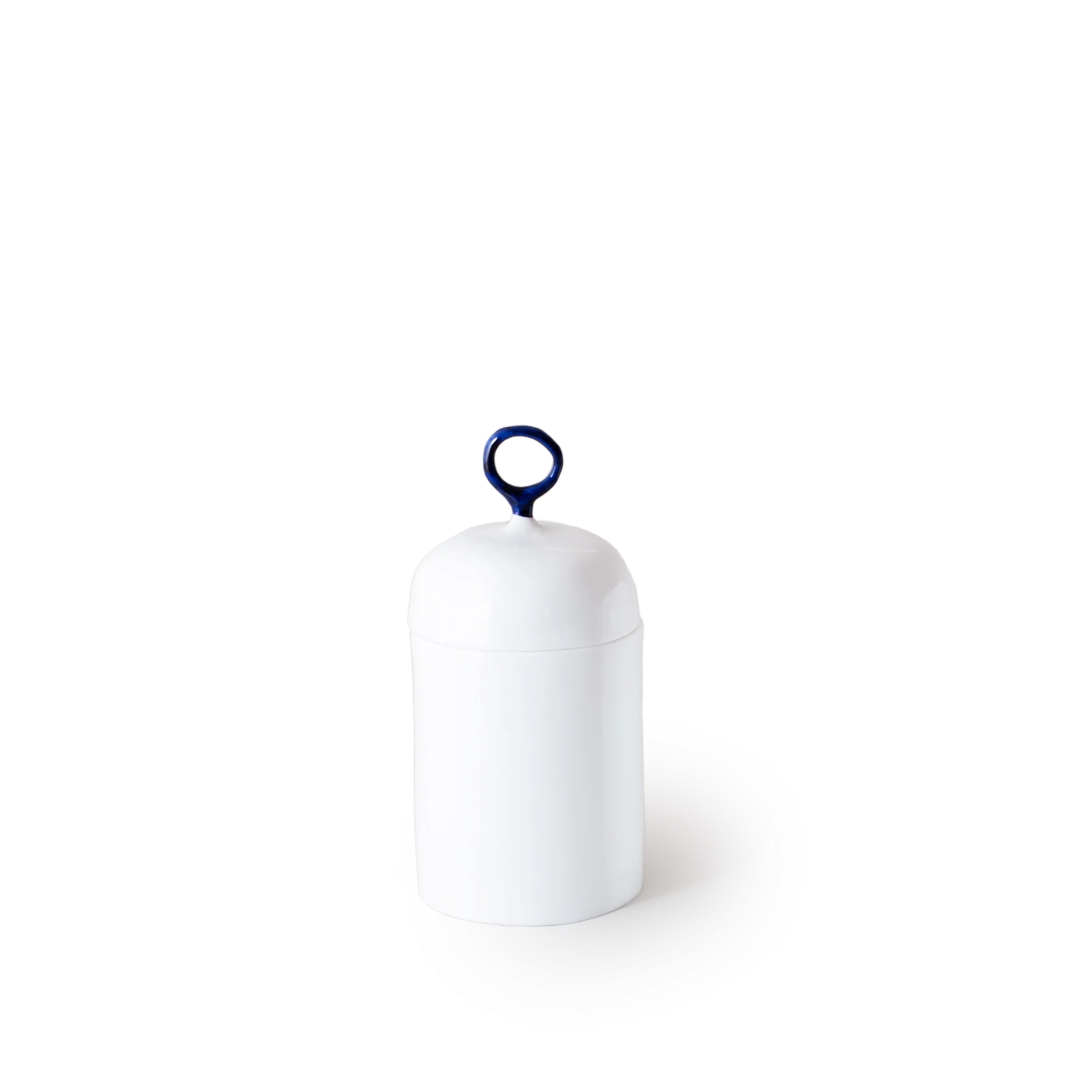 Feldspar trinket pots have lids – ideal for not only hiding away bits and bobs but also for keeping their contents dust-free, with little looped fine bone china handles that are hand-painted in their classic Cobalt. They come in three sizes – small, medium and large. To give an idea of scale, the small are perfect for jewellery, the medium for ear buds and keys and the large for cotton pads or pencils.