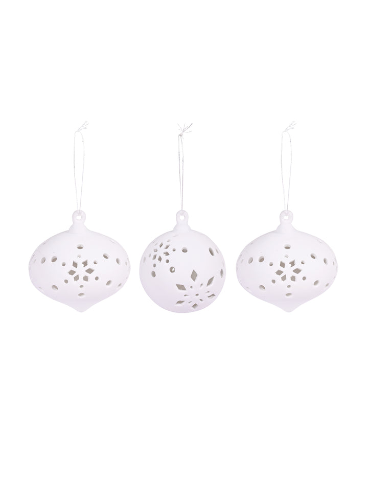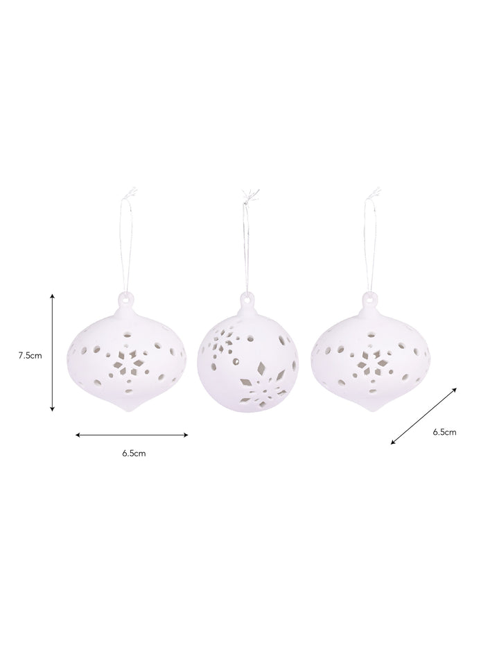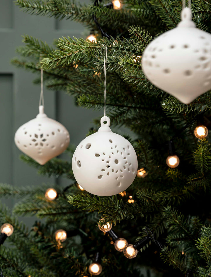 Crafted from wintry white raw porcelain, GArden Trading’s Airdrie Cutwork Baubles bring a Scandinavian note to any tree. Their delicate cutout design comes alive amidst the twinkle of fairy lights, and they look especially good when paired with other hanging decorations from our Airdrie collection.