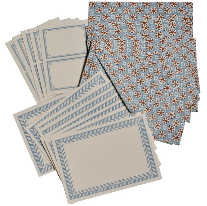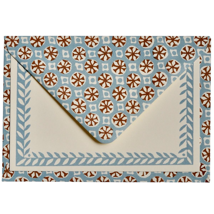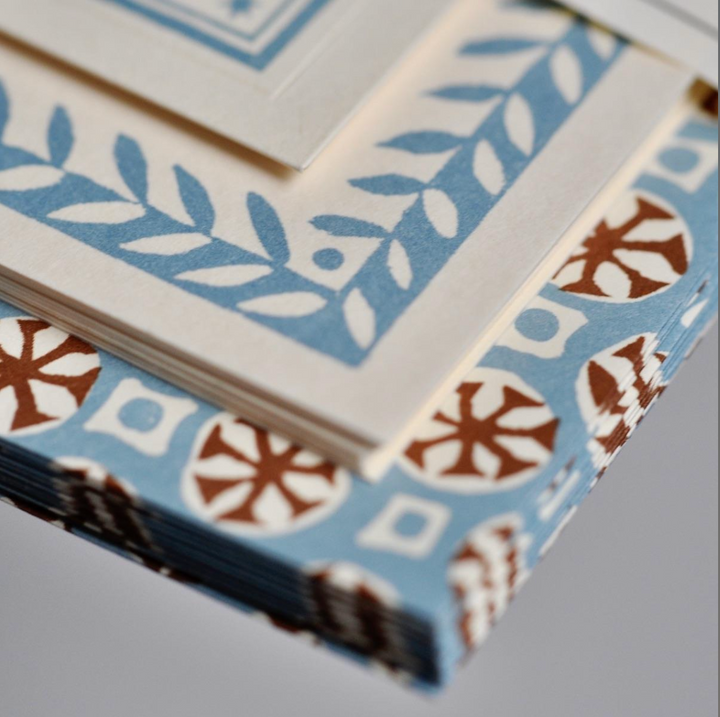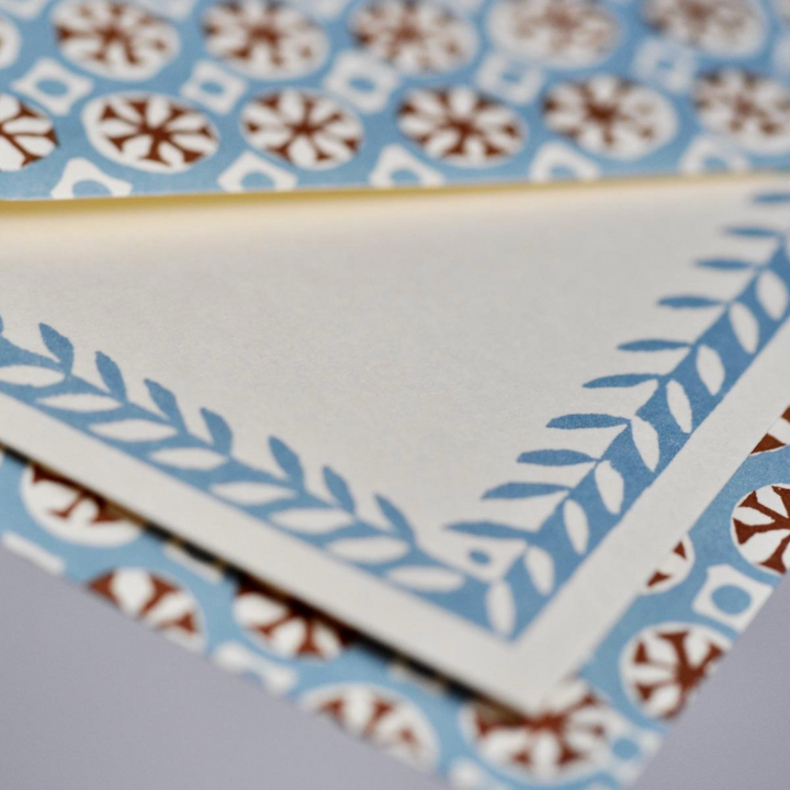 A set of ten Notecards with a patterned border, with matching patterned envelopes and address labels. The Patterned Envelopes are traditional diamond flap envelopes with a water-soluble gummed strip to seal. The Address Labels are self-adhesive. All elements are printed on paper sourced from responsibly managed forests with chain-of-custody certification, and printed in the UK using hand-mixed inks.